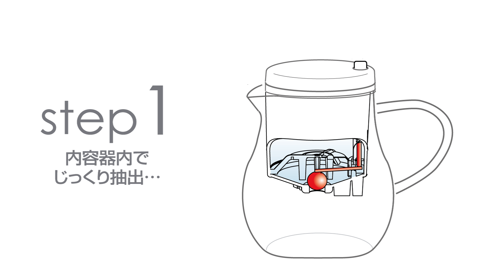 バネも電気も使わず、テコの原理だけでボタンを押すと内容器の栓が開き、出来上がったお茶がポットに落ちてくるシンプルな構造のため故障の心配もありません。